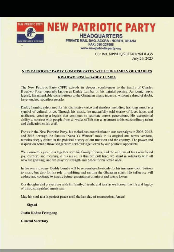 The statement reads: “With profound sorrow and deep grief, the Fosu family announces the passing of Ghana’s beloved musical icon, Charles Kwadwo Fosu, popularly known as Daddy Lumba, who passed away earlier today, Saturday, July 26, 2025, after a short illness.”