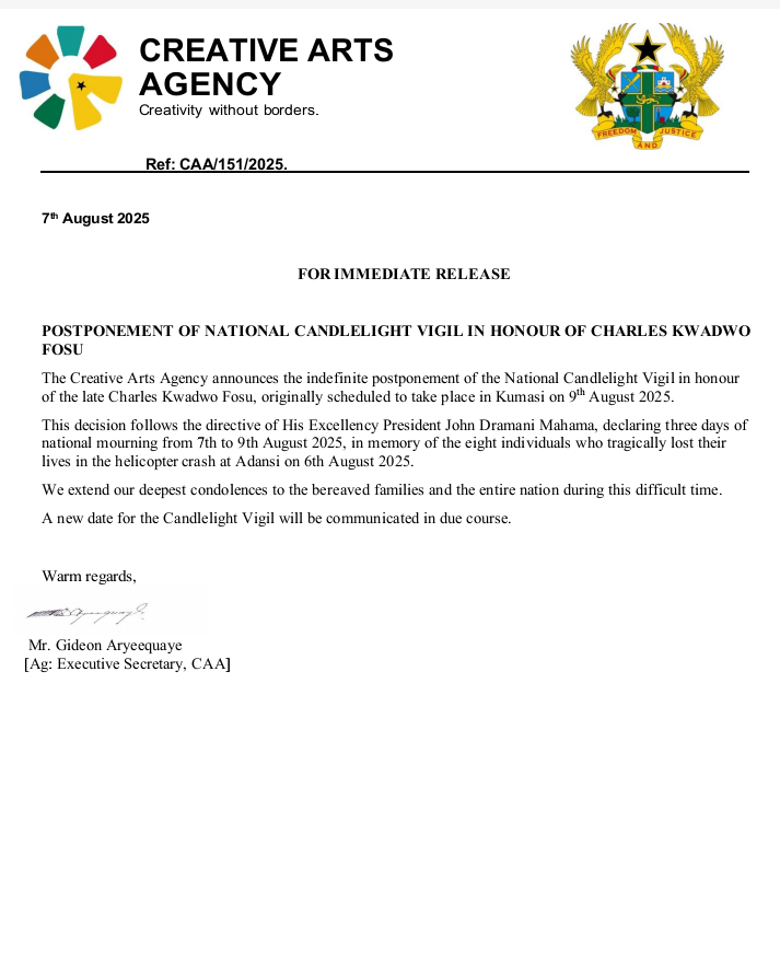 The postponement of the late musician’s funeral is believed to be in response to the national mourning of the tragic passing of the eight heroes who fell in the Adansi helicopter crash on August 6, while on a national assignment.