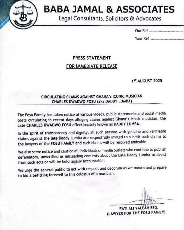 In an official statement issued on July 27 by his lawyers, Baba Jamal & Associates, on behalf of the bereaved family, the family invited all well-wishers, friends, fans, and family to sign the condolence book, which will be available at Daddy Lumba’s private residence in East Legon.