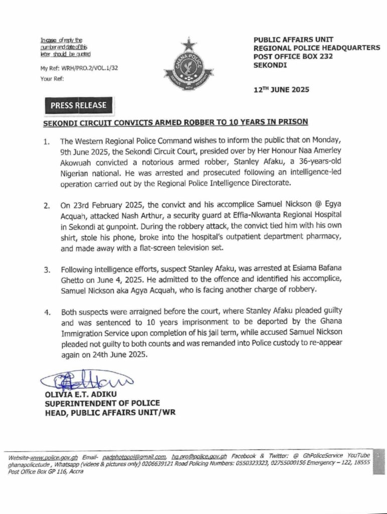 A 36-year-old Nigerian national, Stanley Afaku, has been sentenced to 10 years imprisonment by the Sekondi Circuit Court.