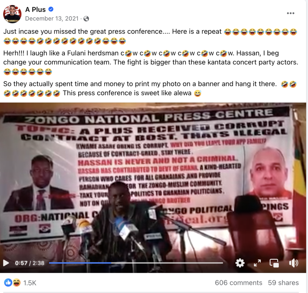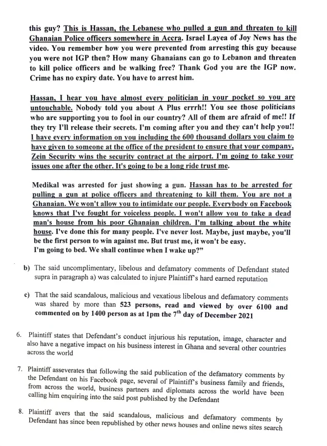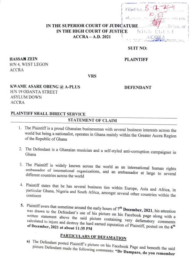 In December 2021, Kwame Asare Obeng, popularly known as A Plus, made certain statements on Facebook that were deemed defamatory towards businessman Hassan Zein.