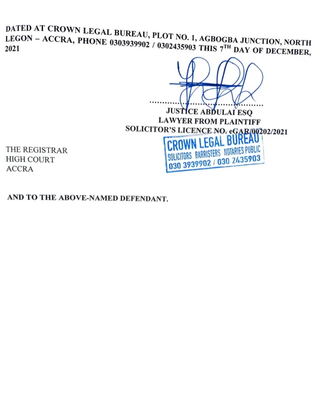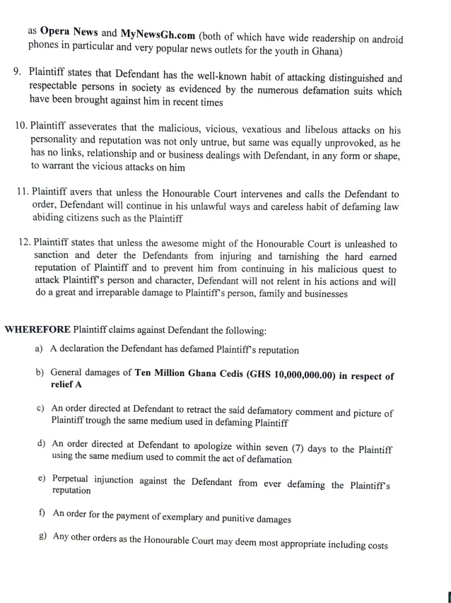 Court records show that Zein sought a range of remedies, including a declaration of defamation, general damages of GH¢10 million, and a directive for A Plus to withdraw the defamatory comments using the same medium they were disseminated.