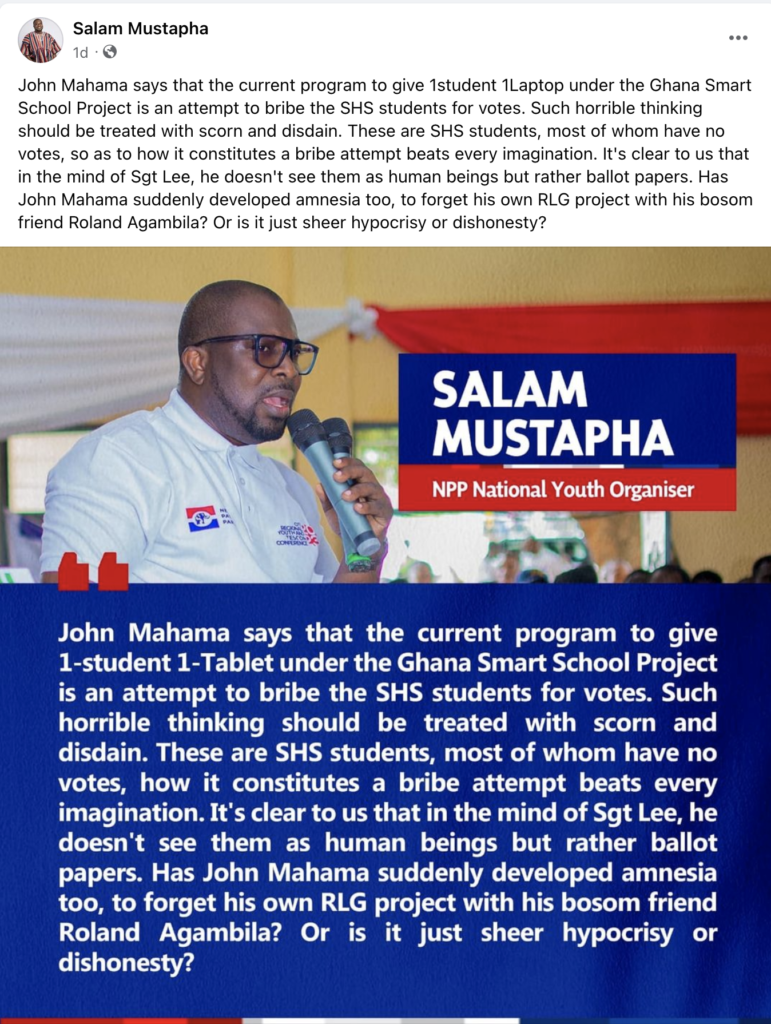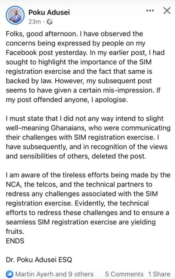I sincerely regret the wrong impression that my comment has created. Indeed, it was not my intention, and never will it be my intention to pray that H.E. John Mahama does not serve his full four-year term when he wins the 2024 general elections.