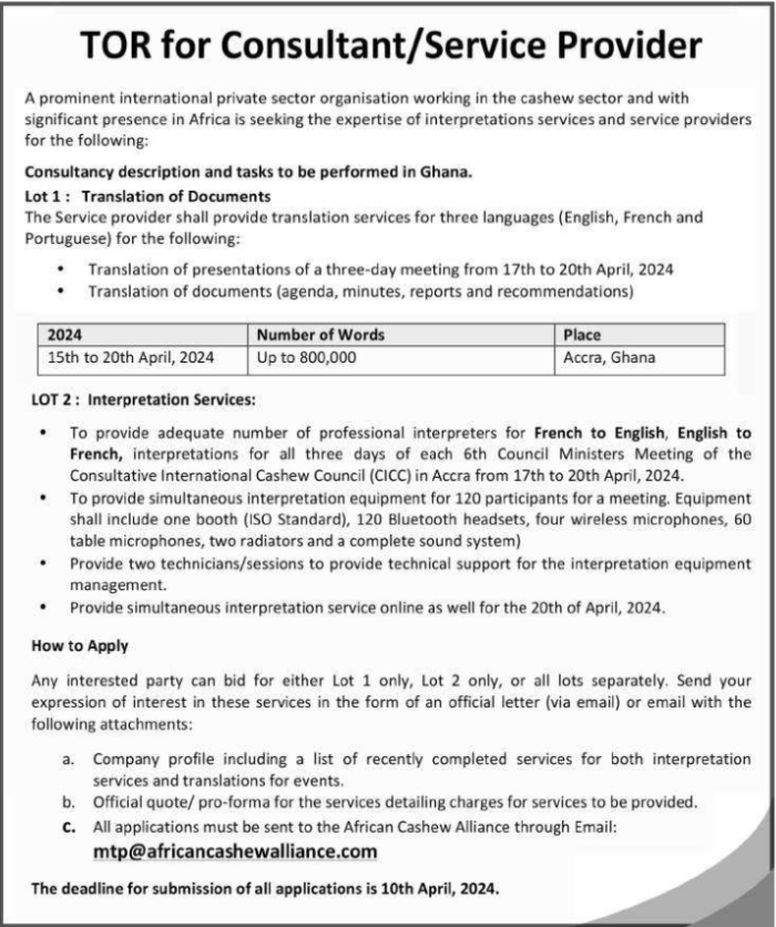 To provide adequate number of professional interpreters for French to English, English to French, interpretations for all three days of each 6th Council Ministers Meeting of the Consultative International Cashew Council (CICC) in Accra from 17th to 20th April, 2024.