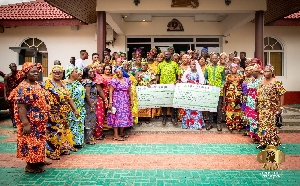 In a significant display of solidarity, Nana Yaa Fowaa, the Market Queen of Kejetia, and Nana Kyeiwaa, the Market Queen of Bantama, led the women in presenting a symbolic cheque to Otumfuo Osei Tutu II at the Manhyia Palace on April 4, 2024.