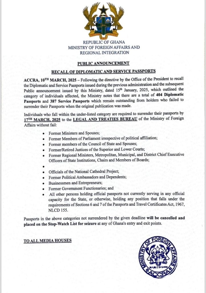 The Ministry has urged former ministers and their spouses, ex-Members of Parliament from all political parties, former Council of State members and their spouses, as well as retired justices of the Superior and Lower Courts, to return their passports immediately.