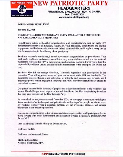 In a message addressed to all elected candidates following the Parliamentary Primaries on Saturday, January 27, 2024, Ntim expressed his heartfelt congratulations.