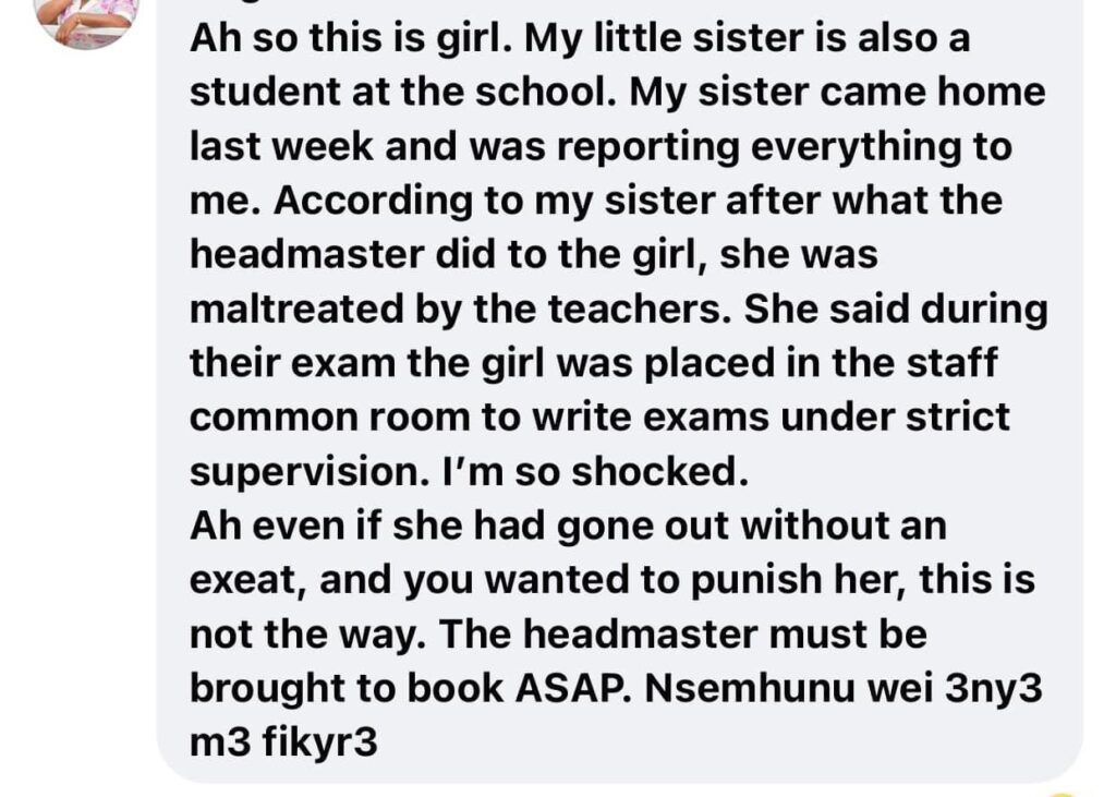 One social media user who claims to have a sibling in the school also alleges that Diana was later discriminated against by some other teachers and was isolated to write her exam in the staff common room.