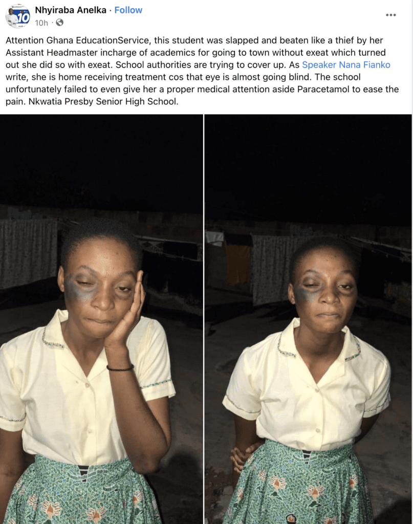 A headmaster of the Nkwatia Presby Senior High School in the Eastern Region has been accused of extreme physical abuse on a female student identified as Diana, leading to her alleged partial blindness.