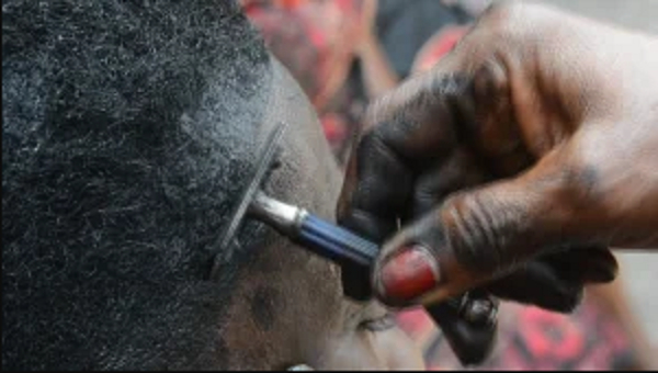 The thick black dye spotted at the edges of the haircut is made up of a mixture of charcoal soot from a cooking pot or fire lamp, and shea butter.