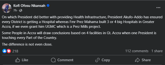 In a Facebook post on Tuesday, November 26, Mr. Ofosu Nkansah described this achievement as unprecedented in Ghana’s history, emphasizing that it cements President Akufo-Addo’s status as the leader who has built the most hospitals in the country.
