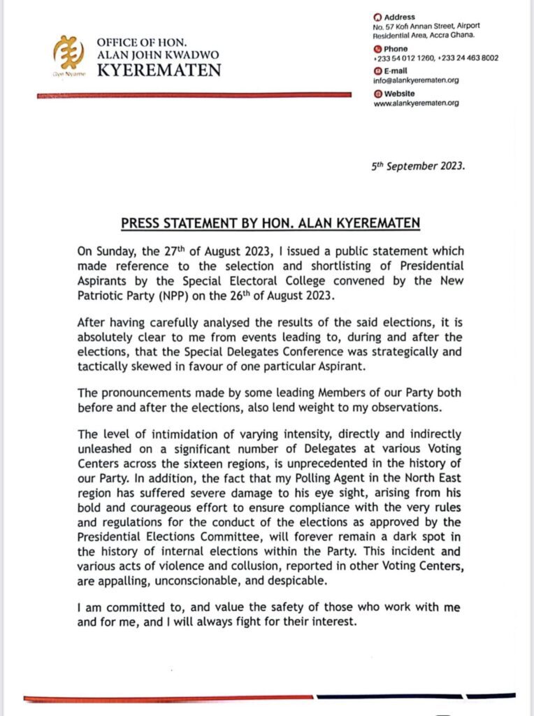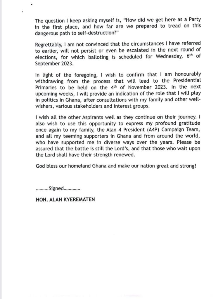 In view of the aforementioned matters, Mr Alan Kyerematen announced that he is “honourably withdrawing from the process that will lead to the Presidential Primaries to be held on the 4th of November 2023.”