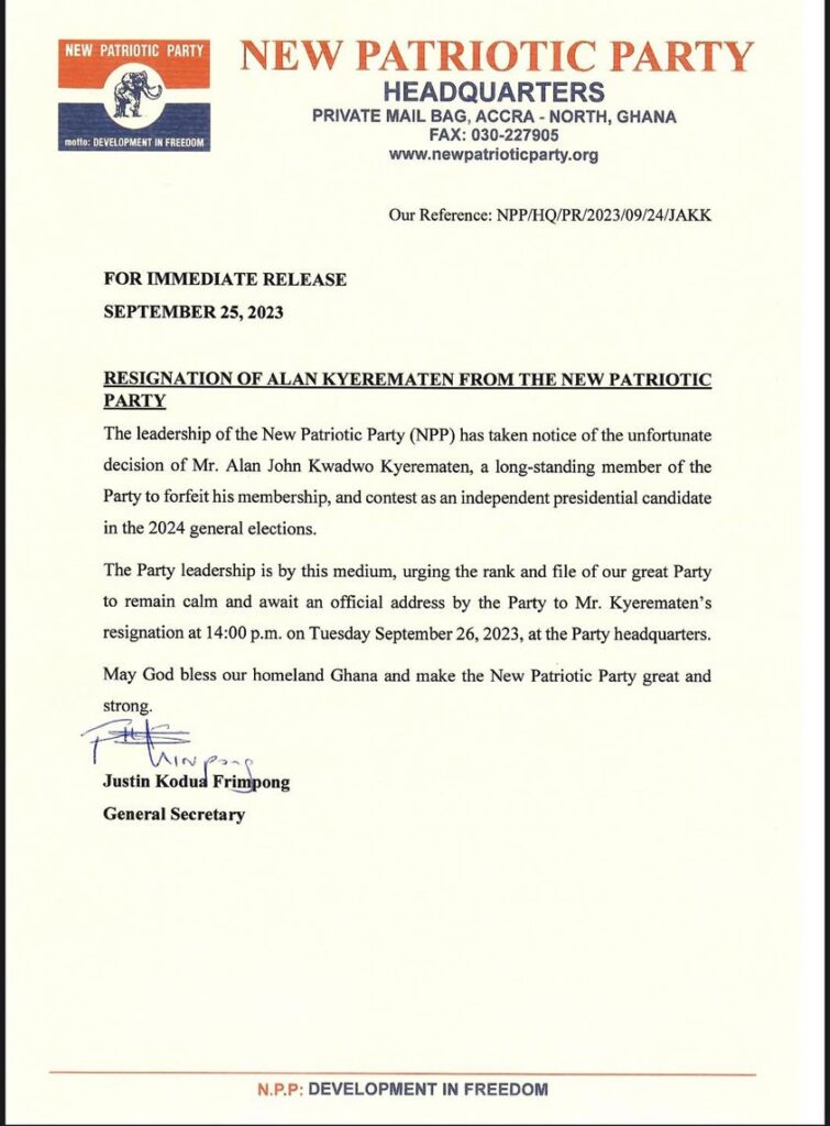 “The leadership of the New Patriotic Party (NPP) has taken notice of the unfortunate decision of Mr. Alan Kwadwo Kyerematen, a long-standing member of the Party to forfeit his membership and contest as an independent presidential candidate in the 2024 general elections,” the statement read.