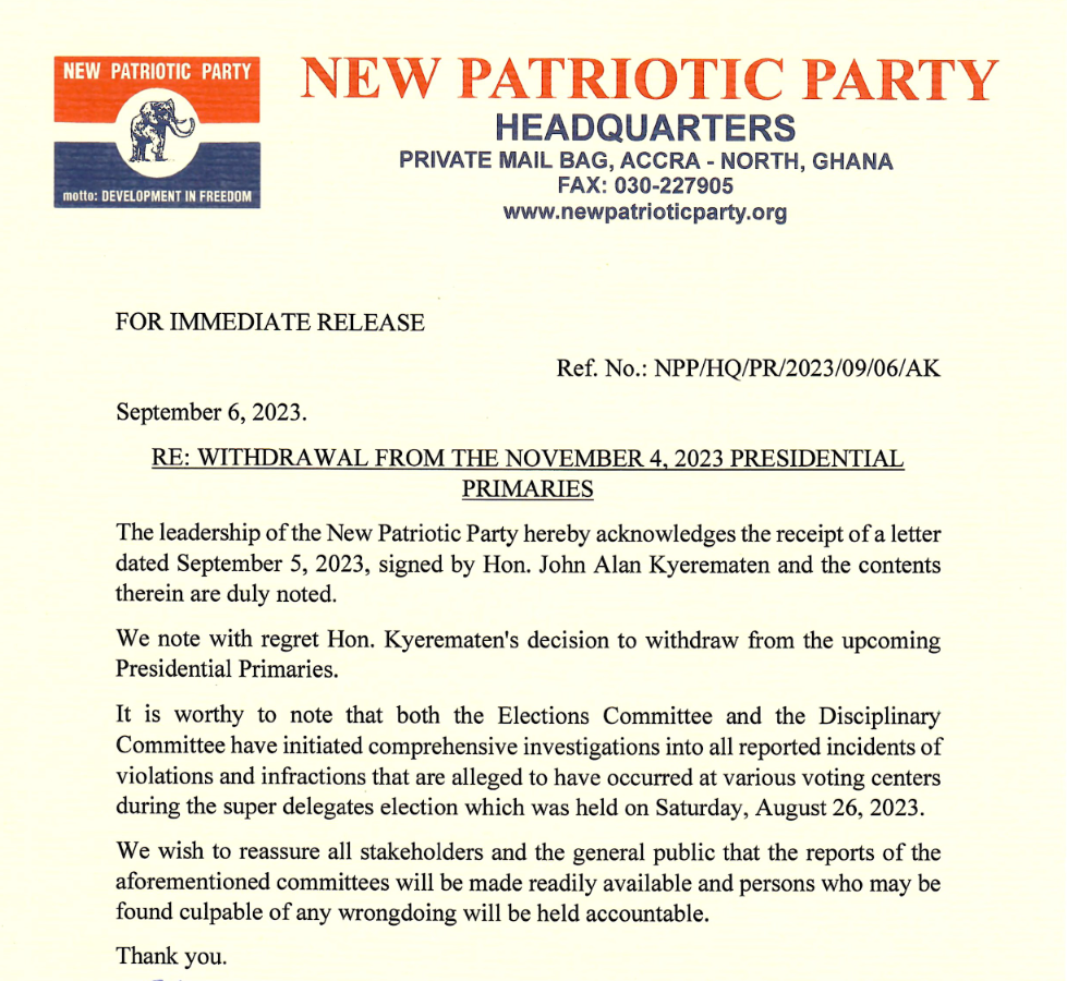 “The leadership of the New Patriotic Party hereby acknowledges the receipt of a letter dated September 5, 2023, signed by Hon. John Alan Kyerematen and the contents therein are duly noted. We note with regret Hon. Kyerematen’s decision to withdraw from the upcoming Presidential Primaries,” the Party noted in its statement.
