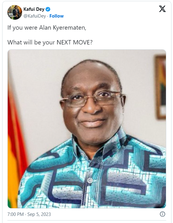 After formally leaving the NPP, Alan is heading a Movement for Change in an effort to win the presidency of Ghana in the general elections of 2024.