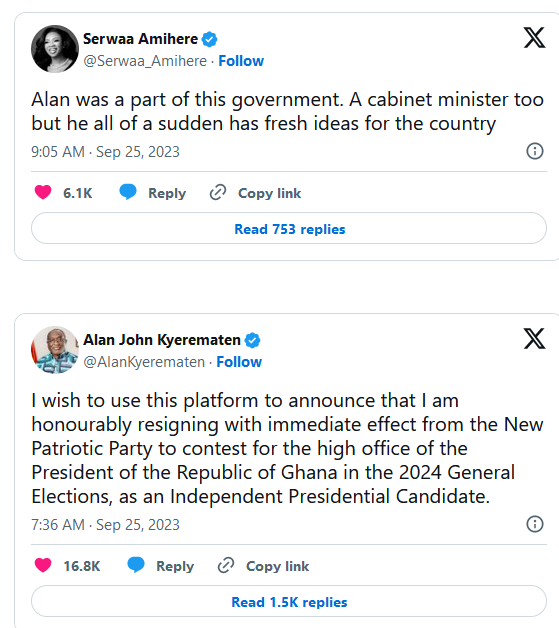Mr. Kyerematen announced his resignation from the NPP on Monday, September 25, to pursue an independent presidential bid.