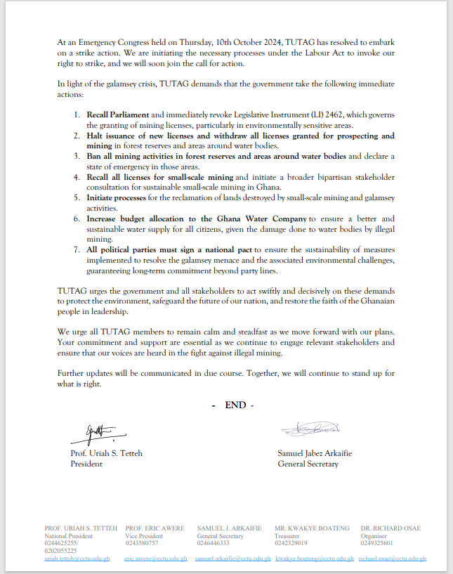TUTAG condemned Organised Labour’s actions as a wasted opportunity to present a united front against the destruction of natural resources, stating, “Despite the betrayal from some quarters, we stand in solidarity with all unions and bodies who have decided to take action through strikes and demonstrations. We wish to assure them of our continued support. At an Emergency Congress held on Thursday, 10th October 2024, TUTAG has resolved to embark on a strike action. We are initiating the necessary processes under the Labour Act to invoke our right to strike, and we will soon join the call for action”.