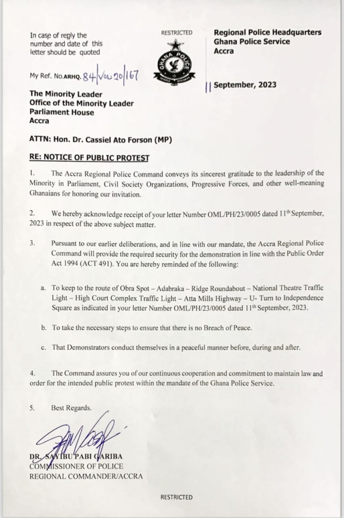 In response to this development, the Police, through a letter addressed to Dr. Cassiel Ato Forson, has requested a meeting on September 5, 2023, to discuss the logistical and operational details of the demonstration.
