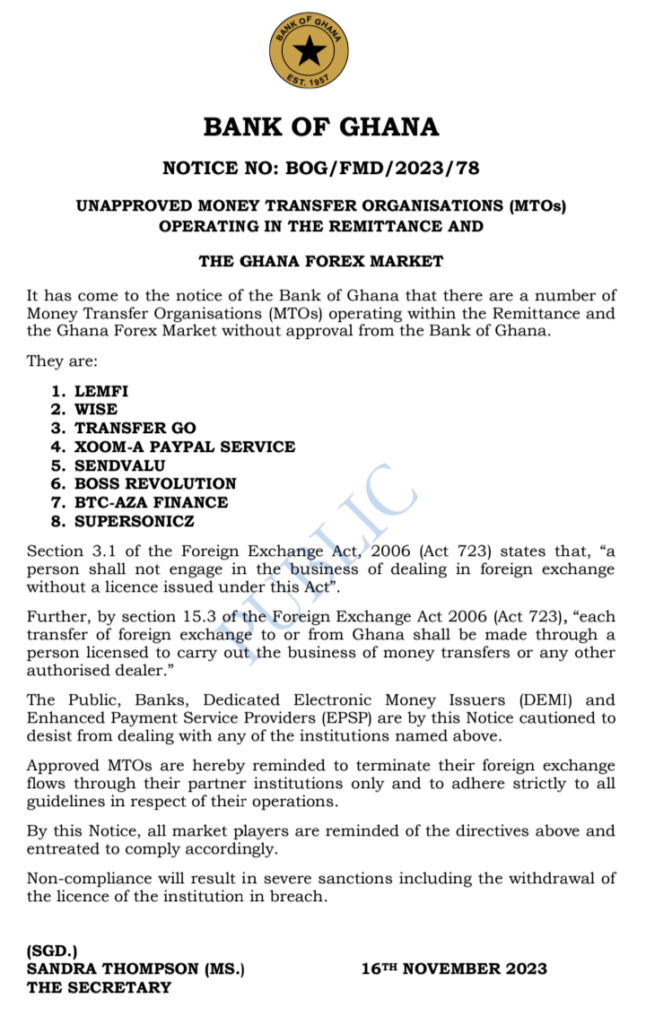 “With Reference to the recent Bank of Ghana Notice (Notice No. BG/GOV/SEC/2023/20) dated November 20, 2023, and titled “Fine and Suspension of Forex Licence of Zeepay Ghana Limited”, we write to inform the general public that we are currently in discussions with the Bank of Ghana to resolve the issues raised in the Notice. However, please note that our general operating licence was not expressly impacted by the Bank’s recent decision. We will ensure strict compliance with all regulations and guidelines”, Zeepay said in its statement.