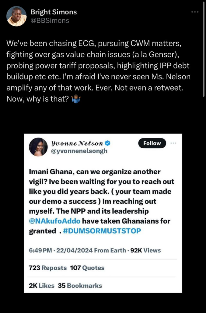 Vice President of IMANI, Bright Simons, has taken a jab at Ghanaian actress, Yvonne Nelson, after she called for the think tank to join her in organizing another ‘dumsor’ demonstration.