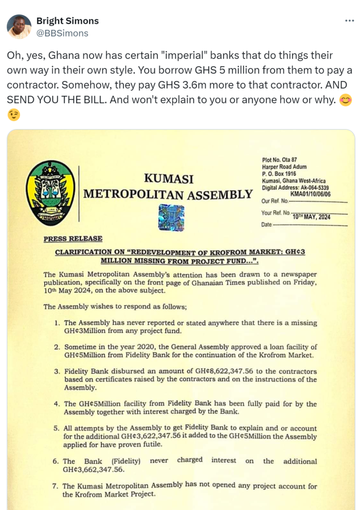 “Fidelity Bank is suing Bright Simons for asking public interest and accountability questions related to its forex dealings with ECG. Fidelity is represented in this case by a lawyer, who’s also an MP paid by taxpayers. This shouldn’t be happening in any serious democracy,” he wrote.