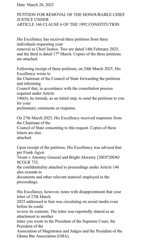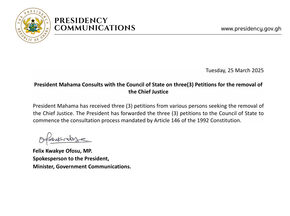 In 2025, the presidency revealed that it had referred seven petitions calling for the removal of the Chairperson of the Electoral Commission Jean Mensa and her Deputies, as well as three separate petitions seeking the removal of the Special Prosecutor Kissi Agyebeng, to the Chief Justice for further investigation.