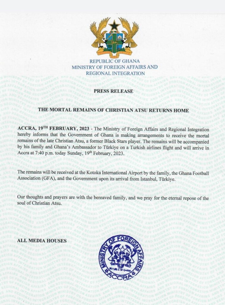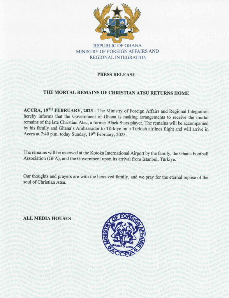 After his club, Hatayspor, confirmed his passing, the Ministry of Foreign Affairs released a statement confirming the arrival of his remains in Ghana on Sunday, February 19, 2023.