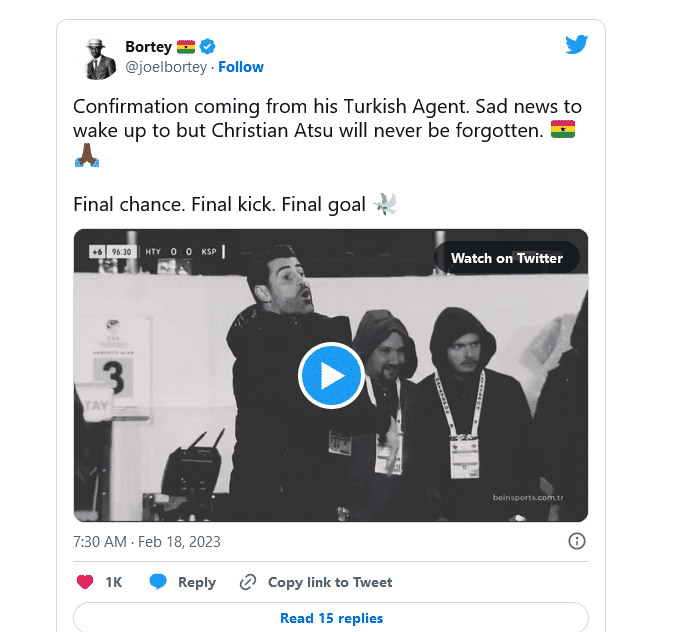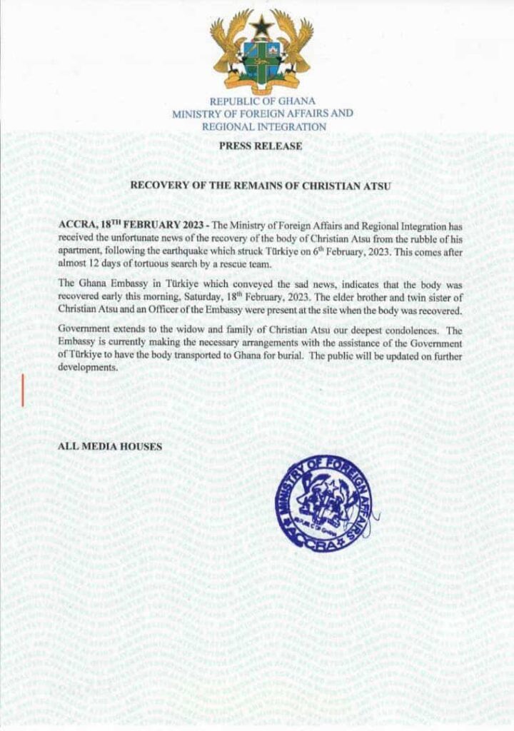 After his club, Hatayspor, confirmed his passing, Ghana’s Ministry of Foreign Affairs also released a statement to that effect.