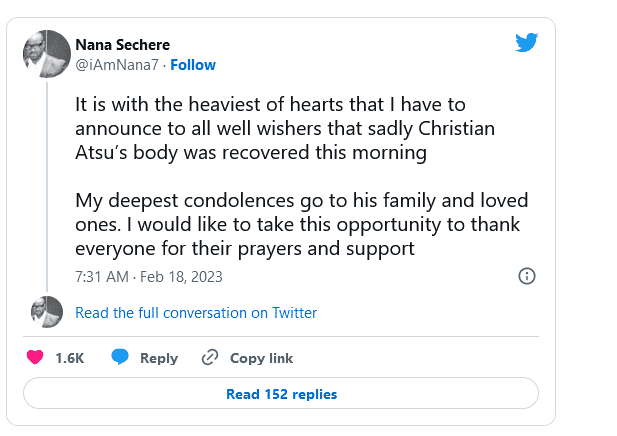 “Nothing can stand in place of death, death is inevitable. With a heavy heart we mourn the death of our brother, Christian Atsu. Job asked God whether man will live again after he dies and God answered him, yes, he will live again.