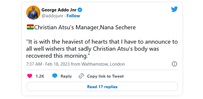 Inna Lillahi wa inna ilayhi raji'un. 🤲🏿❤️. My heart out to @ChristianAtsu20 close & extended family. Still in a state of shock & can’t find words. Until we meet again may the light guide your kind & caring heart brother. pic.twitter.com/vUhsbIPDnC