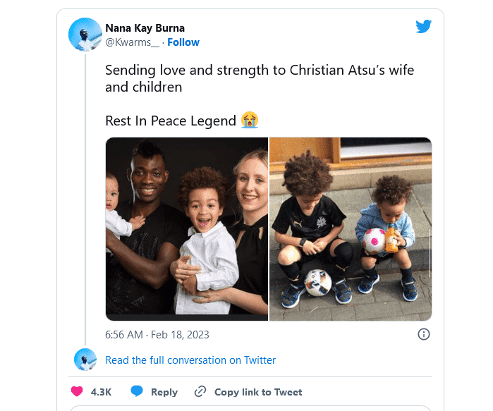 Atsu was a devout Christian who shared Bible verses on social media. He was married to a German, Marie-Claire Rupio, with two sons and a daughter.