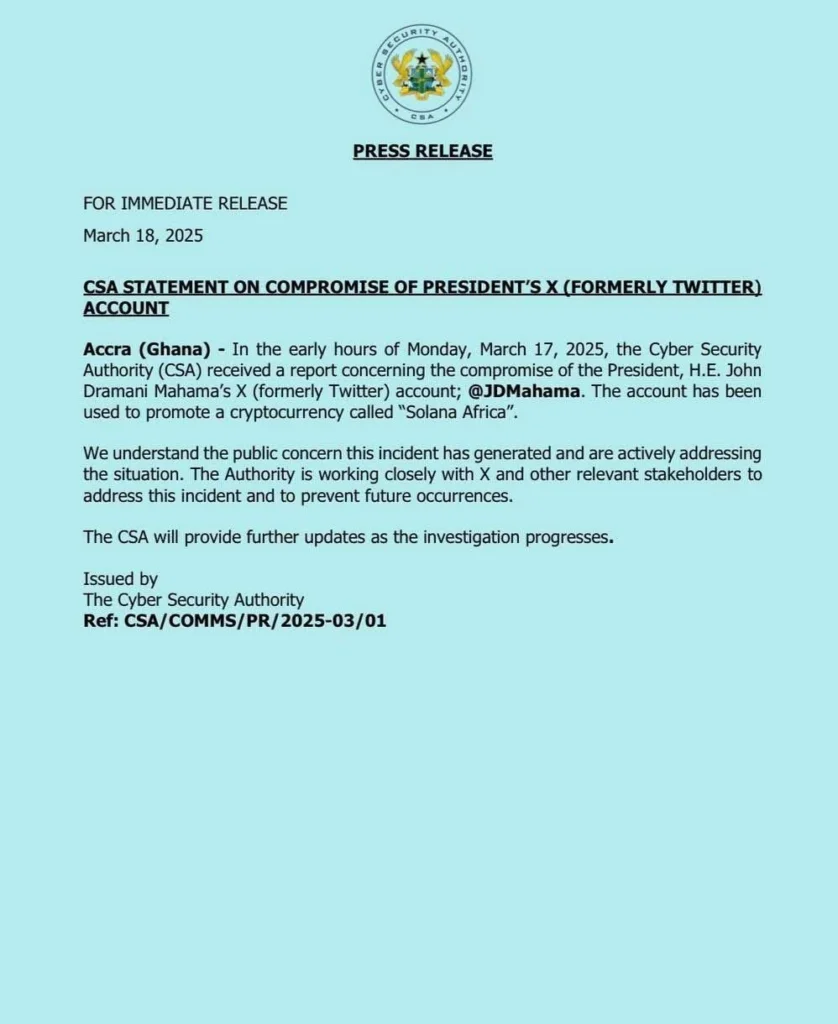 In the early hours of Monday, March 17, the Cyber Security Authority (CSA) received a report concerning the compromise of the President, H.E. John Dramani Mahama’s X (formerly Twitter) account; @JDMahama.