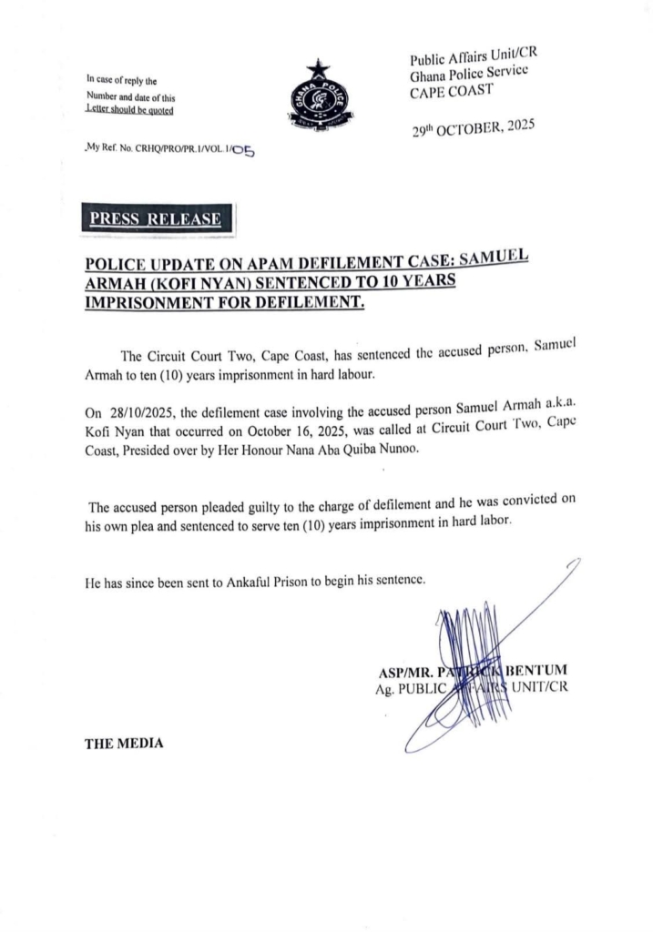 “The Circuit Court Two, Cape Coast, has sentenced the accused person, Samuel Armah, to ten (10) years’ imprisonment in hard labour. On 28/10/2025, the defilement case involving the accused person, Samuel Armah a.k.a. Kofi Nyan, which occurred on October 16, 2025, was called at Circuit Court Two, Cape Coast, presided over by Her Honour Nana Aba Quiba Nunoo.