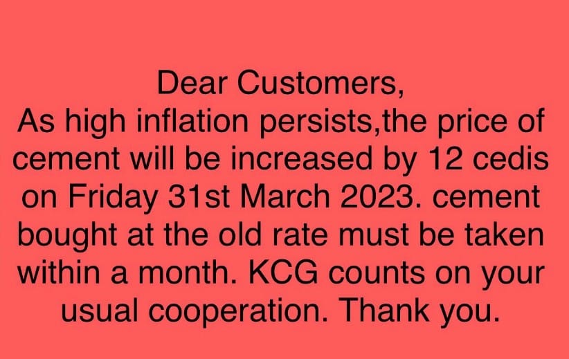 “Dear customers, as high inflation persists, the price of cement will be increased by 12 cedis on Friday 31sy March 2023. Cement bought at the old rate must be taken within a month. KCG counts your usual cooperation,” the notice read.