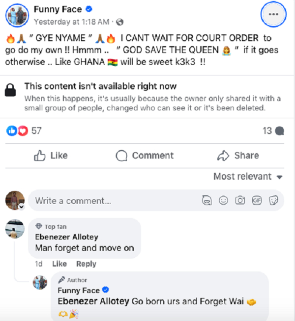 He shared that particular post on Facebook with the caption, “I CAN’T WAIT FOR COURT ORDER to go do my own !! Hmmm .. GOD SAVE THE QUEEN. if it goes otherwise .. Like GHANA will be sweet k3k3 !!”