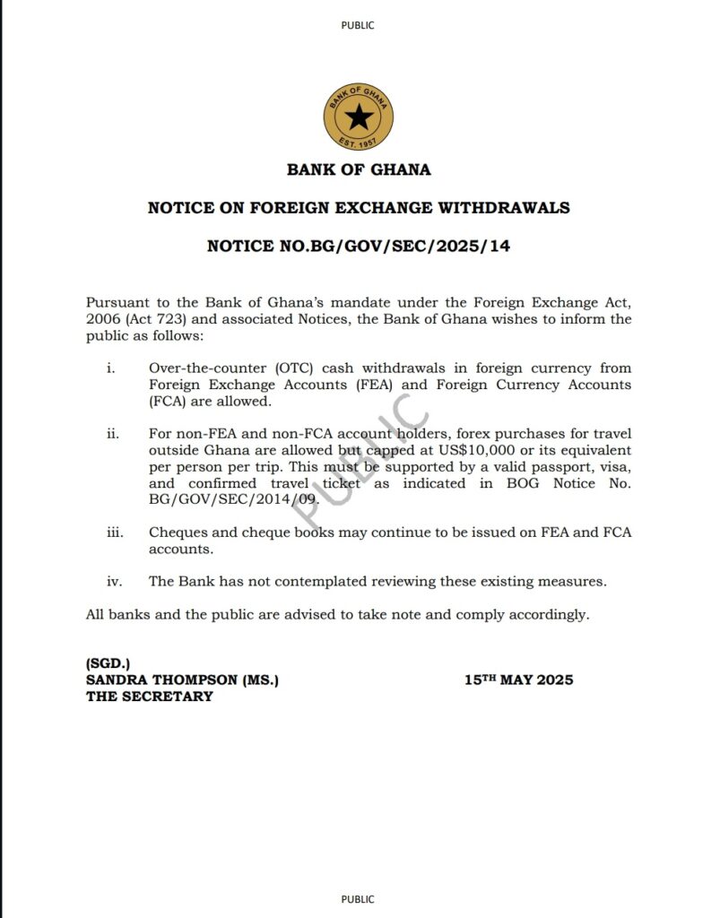 The Bank of Ghana (BoG) has clarified that over-the-counter (OTC) cash withdrawals in foreign currency from Foreign Exchange Accounts (FEA) and Foreign Currency Accounts (FCA) are allowed.