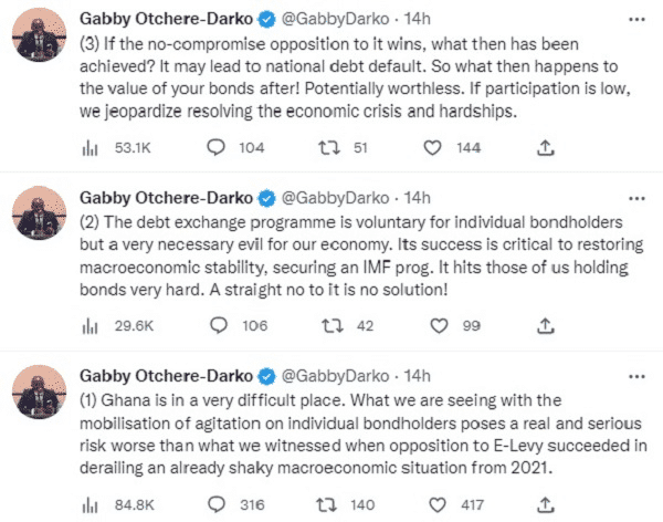 “Ghana is in a very difficult place. What we are seeing with the mobilisation of agitation on individual bondholders poses a real and serious risk worse than what we witnessed when opposition to E-levy succeeded in derailing an already shaky macroeconomic situation from 2021,” portions of his tweets read.