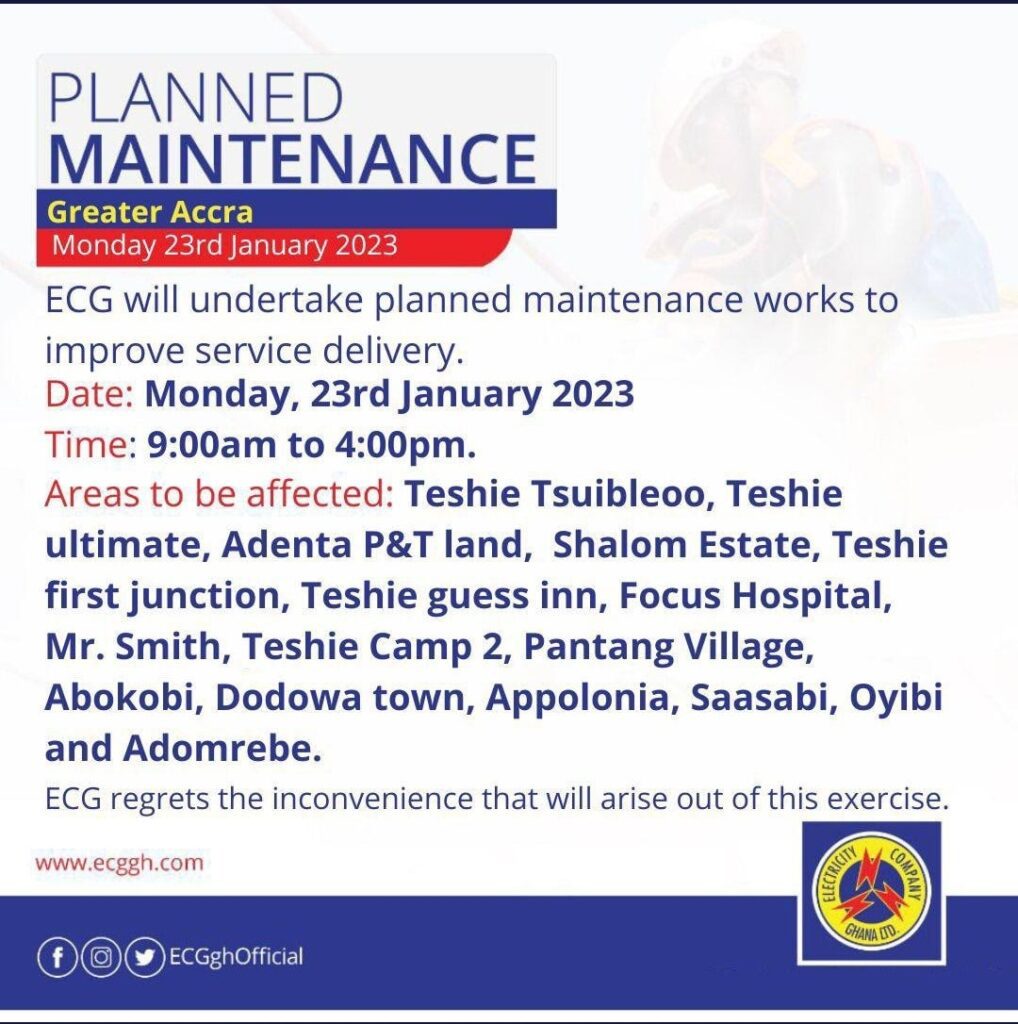 The ECG in a statement explained that this is due to “maintenance works being carried out by the Ghana National Gas Company(GNGC) at Atuabo, [hence] there is a power generation shortfall. In this regard, please find below a load management schedule from Thursday, 30th March to Friday 7th April 2023, between 6.00pm and 11.00pm”.