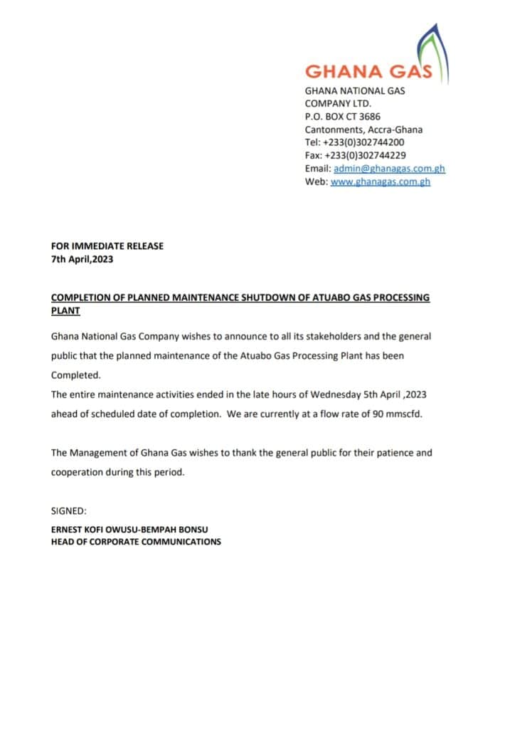 A statement issued late Friday, April 7, 2023, signed by Head of Corporate Communications of GNGC, Ernest Kofi Owusu Bempah Bonsu, indicated, “the entire maintenance activities ended in the late hours of Wednesday 5th April ,2023”.