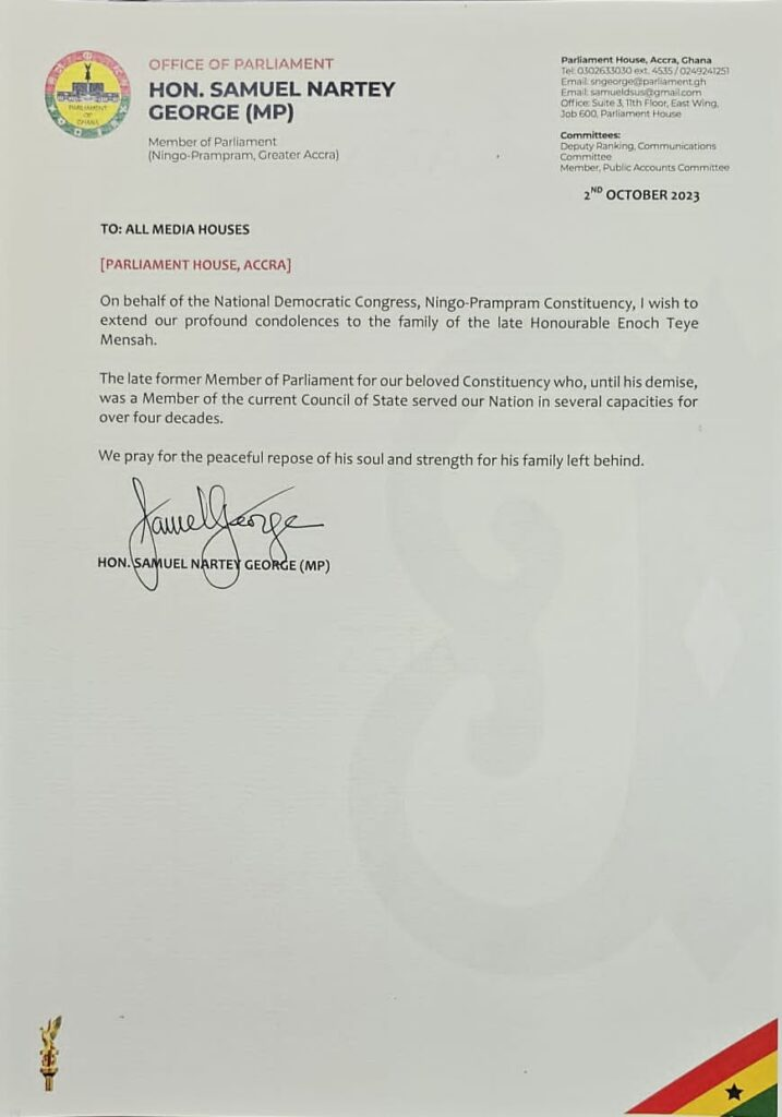 He expressed his condolences to Mr. Mensah’s family and all those who admired him.