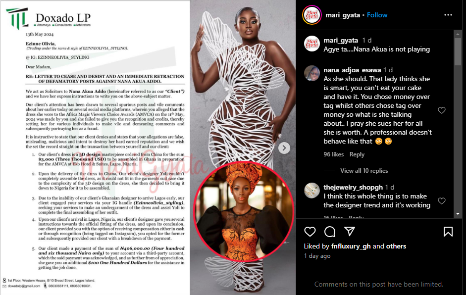 Ghanaian style icon Nana Akua Addo has set a 48-hour deadline for Nigerian fashion designer Ezinne Olivia to publicly apologize or face legal consequences.