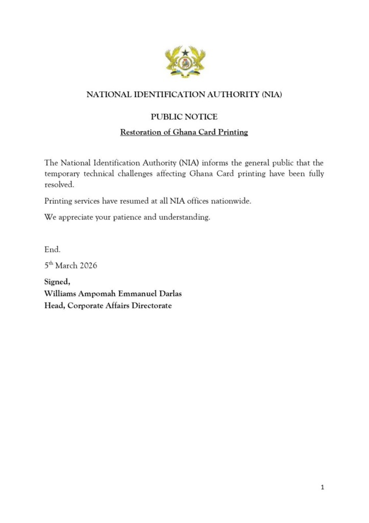 The National Identification Authority (NIA) has announced that it has fully resolved the technical challenges that were affecting Ghana Card printing.
