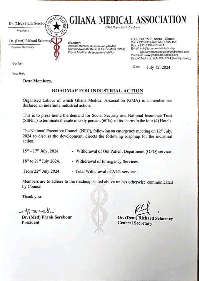 The Ghana Medical Association (GMA) has instructed all medical doctors to join a nationwide strike starting on Monday, July 15, 2024, as part of Organised Labour‘s declared industrial action.