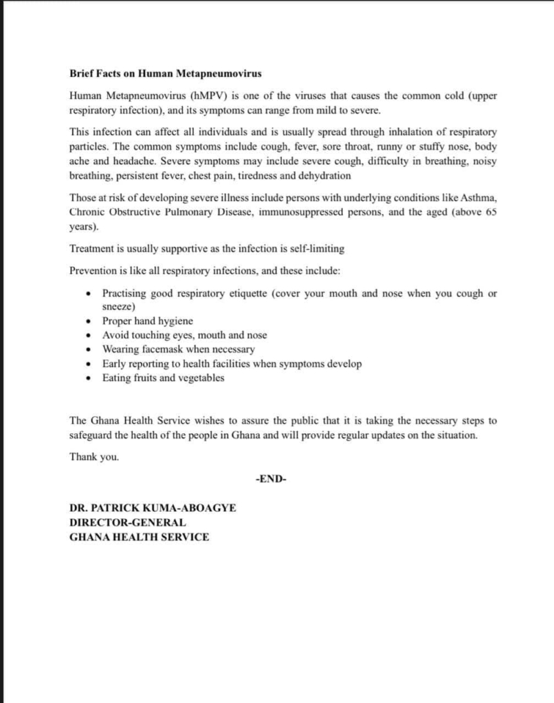 The GHS has advised the public to avoid close contact with symptomatic individuals, practice regular handwashing, avoid frequent face-touching, and use masks when caring for infected persons.