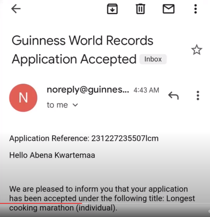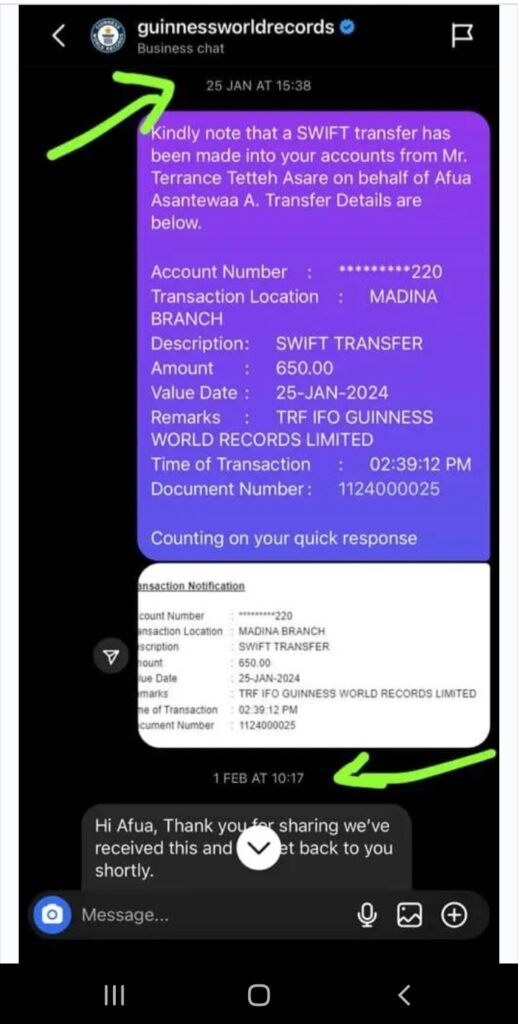 Notably, the screenshots also showed that Guinness World Records acknowledged receiving evidence related to Afua’s record attempt and the payment she made for a quick review.