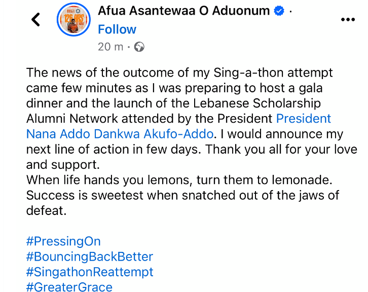 Encouraged by the overwhelming show of solidarity, Afua Asantewaa Aduonum has now declared her intention to reattempt the Guinness World Records sing-a-thon, following the setback of her initial attempt.