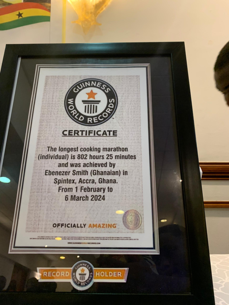 The certificate shown at the event read: “The longest cooking marathon (individual) is 802 hours 25 minutes and was achieved by Ebenezer Smith (Ghanaian) in Spintex, Accra, Ghana. From 1 February to 6 March, 2024.”
