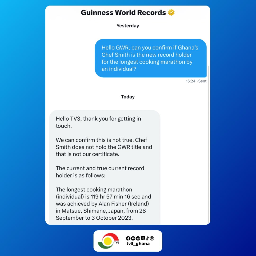 Guinness World Records (GWR) has refuted Ghanaian chef Chef Smith’s claim of holding the longest cooking marathon title, declaring the certificate he presented as fake.
