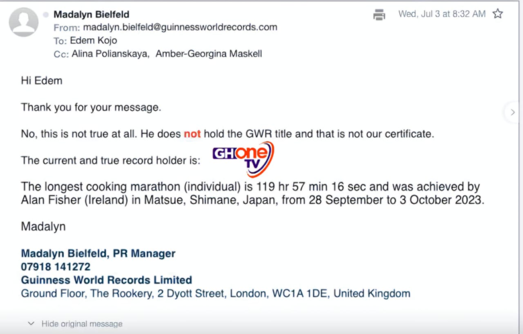 “No, this is not true at all. He does not hold the GWR title and that is not our certificate,” Bielfield stated, affirming the doubts raised by many regarding the authenticity of the certificate displayed by Chef Smith.