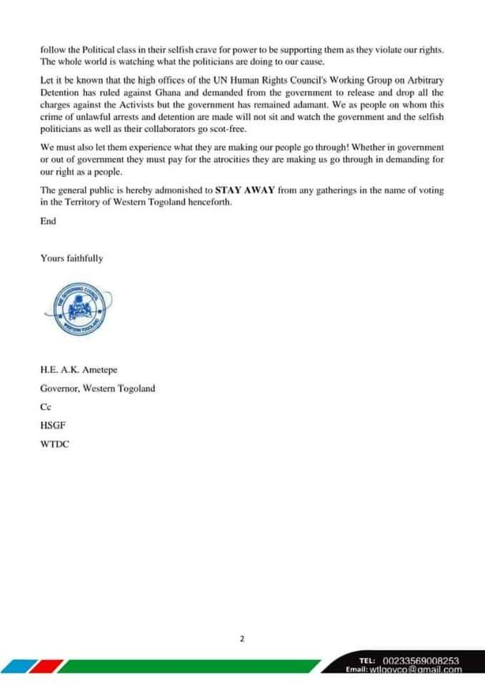 The leadership of the council has urged the public to stay away from any gatherings related to voting in Western Togoland.